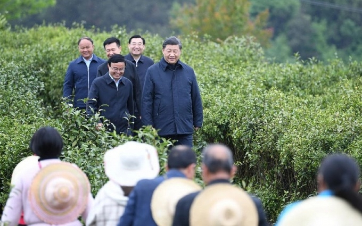 Chủ tịch Trung Quốc Tập Cận Bình (ở tâm ảnh) trong một lần đi tìm hiểu thực tế nông nghiệp thân thiện với môi trường ở địa phương vào năm 2021. (Ảnh: Tân Hoa xã)