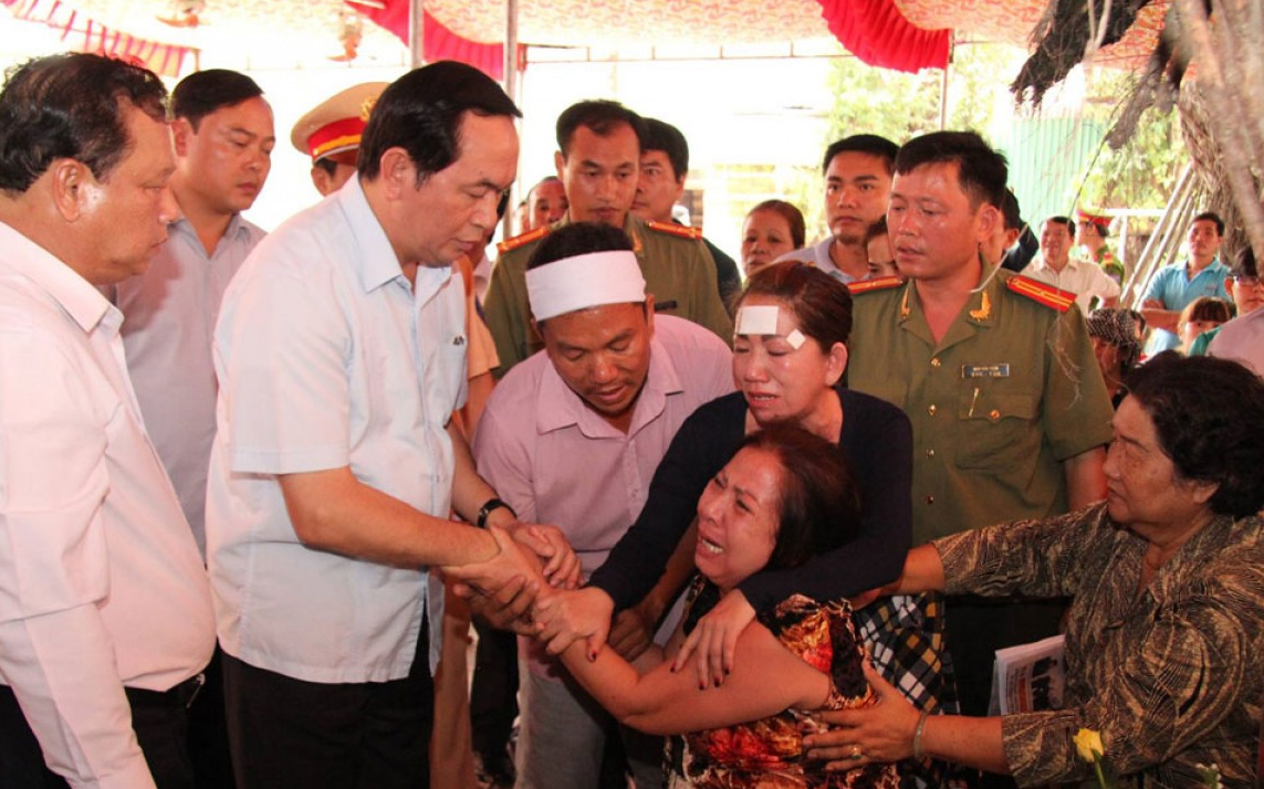 Trong trang phục đời thường, Đại tướng Trần Đại Quang nắm chặt tay chia sẻ nỗi mất mát quá lớn của thân nhân nạn nhân – đối với người viết bài, đây là hình ảnh gây xúc động hơn cả |