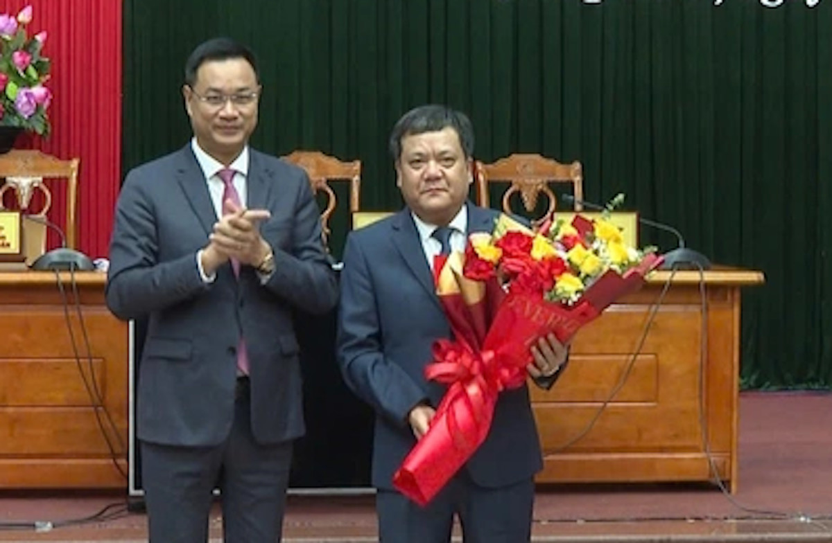 Ông Lê Ngọc Quang - Bí thư Tỉnh uỷ Quảng Bình (trái) tặng hoa chúc mừng tân Chủ tịch UBND tỉnh Trần Phong.