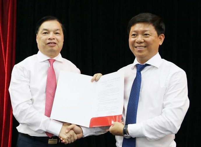 Ông Lê Mạnh Hùng trao quyết định cho tân Vụ trưởng Vụ Báo chí - Xuất bản Trần Thanh Lâm. (Ảnh: Tuyengiao.vn).