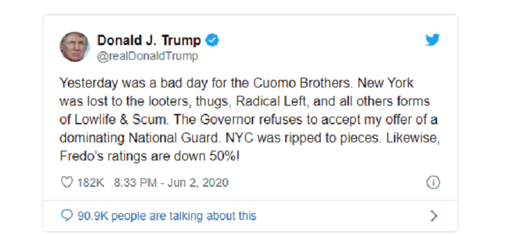 Trong một bài đăng trên Twitter hôm 2/6, ông Trump chỉ trích Thống đốc New York Andrew Cuomo và anh trai ông, nhà báo CNN Chris Cuomo.