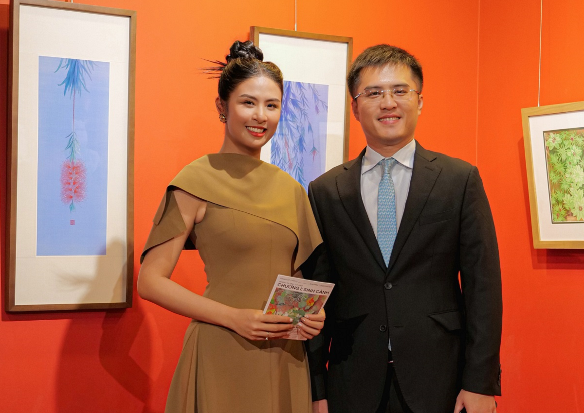 Người đẹp tiết lộ: "Anh cũng là người có đam mê lớn với hội họa và khi trực tiếp đi thưởng lãm tranh về thảm thực vật Đà Lạt do vợ tổ chức, anh rất thích thú”.