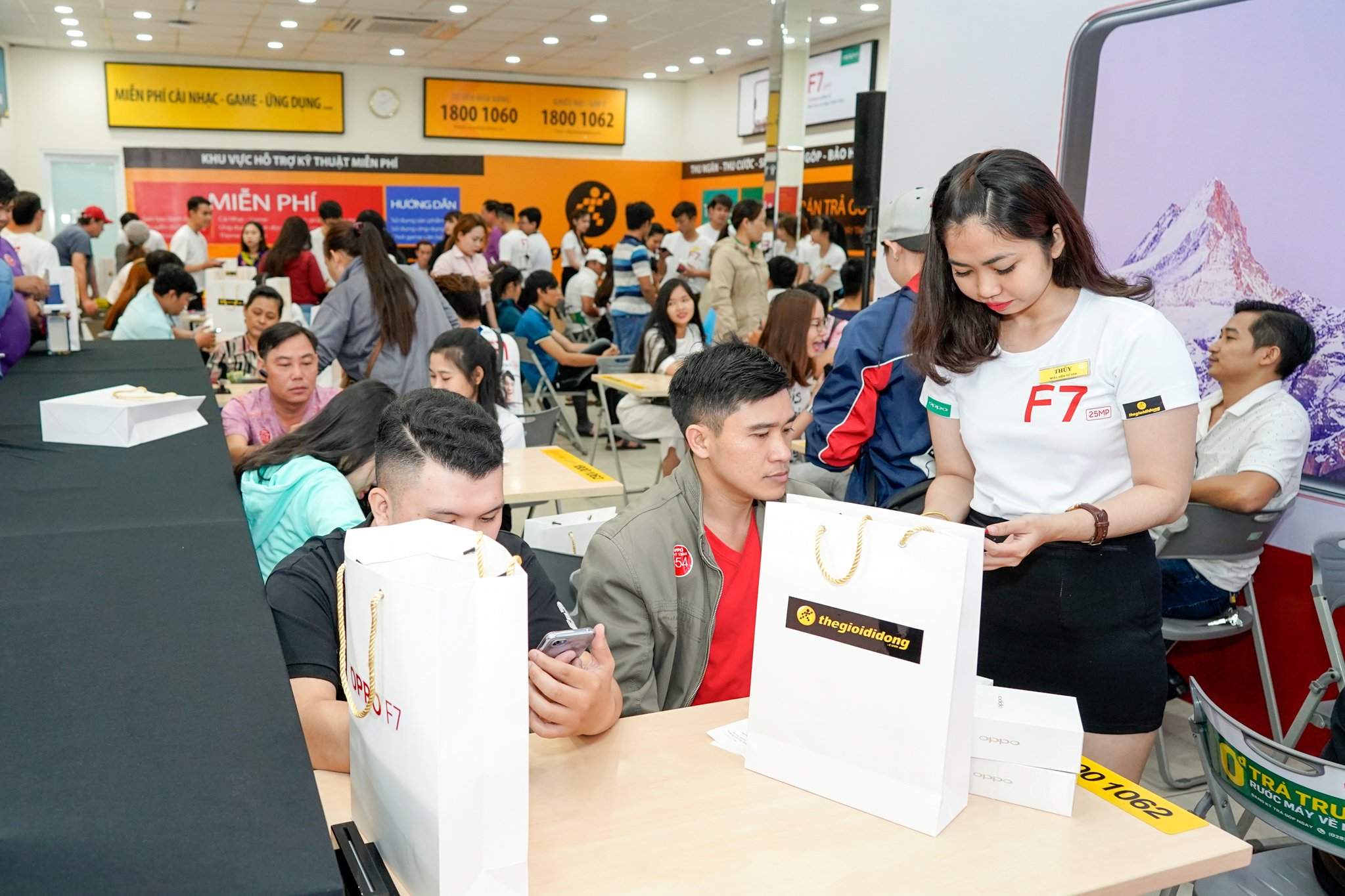 Ngay trong ngày mở bán, rất đông những khách hàng đã đến nhận máy. Bạn Nguyễn Hữu Quốc, một khách hàng nhận máy ở FPT Shop chia sẻ: “Tôi dùng điện thoại OPPO F3, vẫn còn tốt, nhưng khi nhìn thấy F7 màu đỏ, tôi đã thích ngay. Máy có màn hình lớn và màu đỏ thì hợp mạng với tôi. Chiếc điện thoại này nhìn rất sang trọng, cấu hình mạnh giải trí tốt hơn”. Có khá nhiều lý do để người dùng nâng cấp hay chọn OPPO F7, chị N.T.T. Vân, người đặt hàng trước nói “mình thích selfie, dù không còn trẻ trung nhưng ai lại không muốn hình lung linh hơn. Nghe nói OPPO F7 có tính năng selfie thông minh, tự cân bằng, tự chỉnh sửa, thậm chí trang điểm cho mình nên đặt mua. Với lại điện thoại này cũng đẹp nữa, mình muốn đẹp thì điện thoại cũng đẹp chứ (cười)”.