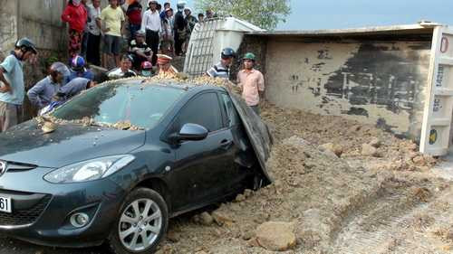 Xe tải lật ngang khiến hàng chục tấn đất đá đổ lên ôtô 4 chỗ và xe máy đang đậu bên đường.