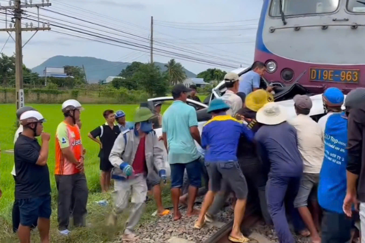 Cú tông mạnh khiến tàu hỏa đẩy ô tô một đoạn đường 200m, trong xe có tài xế xe ô tô bị gãy tay và chân.