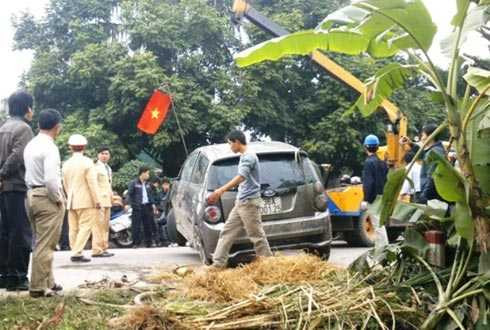 Theo một số người dân, chiều 19/1, ôtô Kia Moning màu xám đi đến xã Quảng Yên (Quảng Xương, Thanh Hóa) bỗng tông vào cột điện bên phải đường rồi lao xuống ao gần đó.