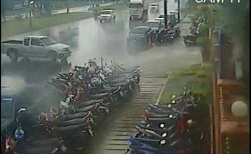 (VTC News) - Do đường trơn nên chiếc bán tải đã xô đổ cả hàng xe máy, làm chúng đổ như trò domino.