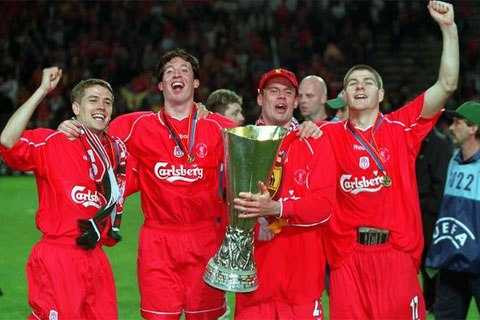 | Owen (trái) và Carragher (thứ ba từ trái sang) hồi còn cùng ở Liverpool |