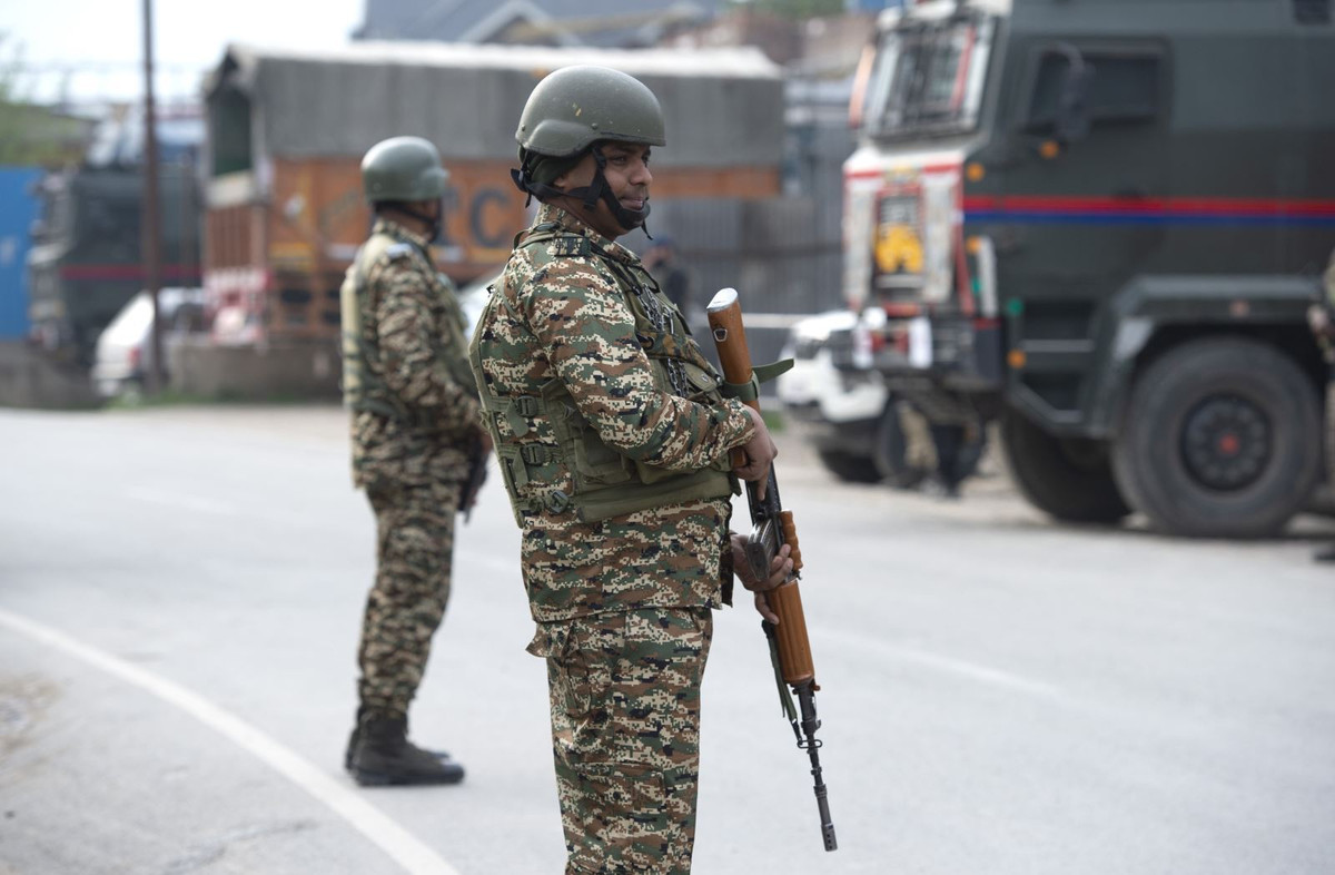 Binh sĩ bán quân sự Ấn Độ gác gần trạm kiểm soát ở ngoại ô thành phố Srinagar. (Ảnh: THX)