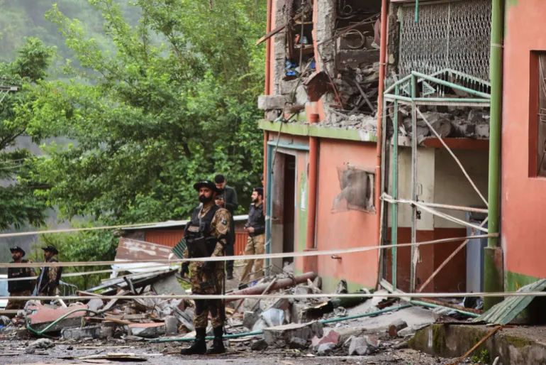 Binh lính Pakistan đứng canh tại nhà thờ Hồi giáo bị hư hại sau cuộc tấn công của Ấn Độ. (Ảnh: AP)