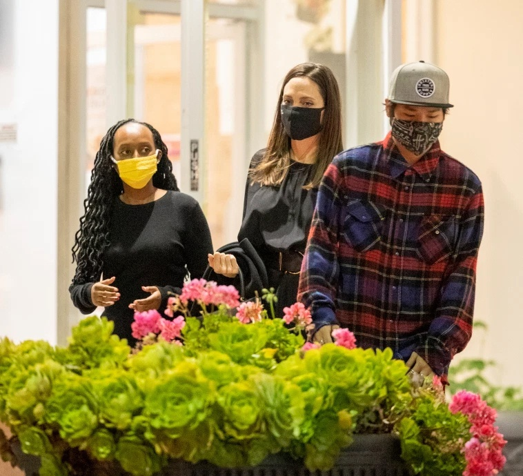 Trong buổi xuống phố, Angelina Jolie cùng Pax Thiên, Zahara mang khẩu trang theo quy định phòng dịch. Như thường lệ, minh tinh 46 tuổi diện trang phục giản dị, không trang điểm. Con gái gốc Phi của Jolie cũng mặc nguyên cây đen.