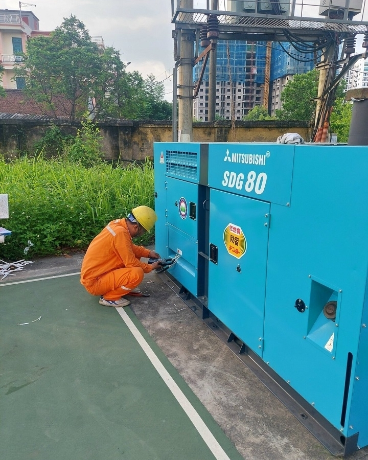 Công nhân Điện lực Thành phố thực hiện đấu nối máy phát dự phòng.