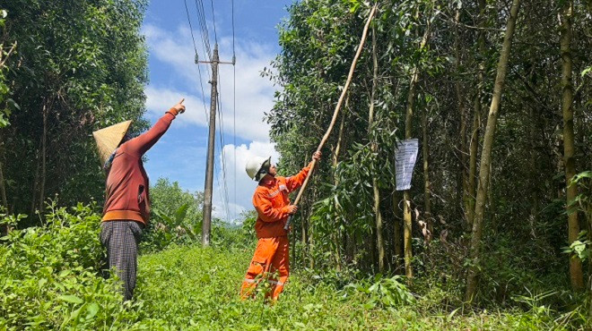 Người dân Trà Bồng cùng với công nhân điện thực hiện cắt tỉa cành cây, đảm bảo an toàn cho hành lang lưới điện.