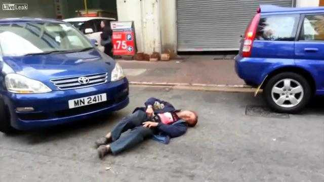 Trên đường phố Hồng Kông, người đàn ông đi bộ cầm điện thoại giả vờ ngã ngay trước mũi xe ô tô vô cùng thô thiển.