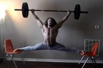 Trong video, anh này nâng tạ 100 pound (khoảng 45 kg), tuy số cân nặng không đáng kể nhưng điều khó là anh chàng vừa nâng tạ vừa xoạc chân trên 2 chiếc ghế. Không có được điểm tựa vững chắc, việc nâng tạ xoạc chân này quả thực rất khó và là một sự thách thức tới các lực sỹ.