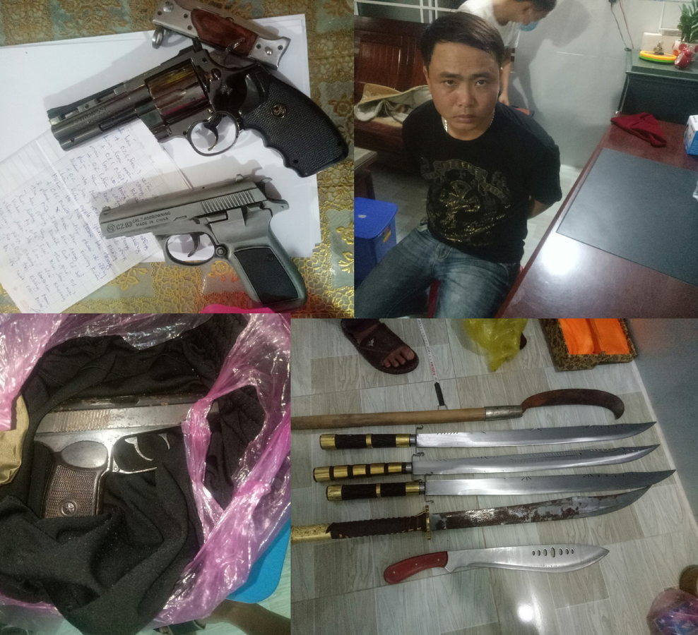 Qua kiểm tra nhanh, lực lượng công an còn phát hiện Bùi Minh Kim (30 tuổi, chủ tiệm cầm đồ) có tàng trữ 1 khẩu súng quân dụng K59 trong có 7 viên đạn, 2 súng bắn đạn chì và nhiều dao, mã tấu.