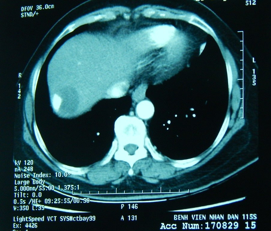 Vị trí khối u gan của bệnh nhân Ngô Kim Th. được thể hiện qua phim X-quang