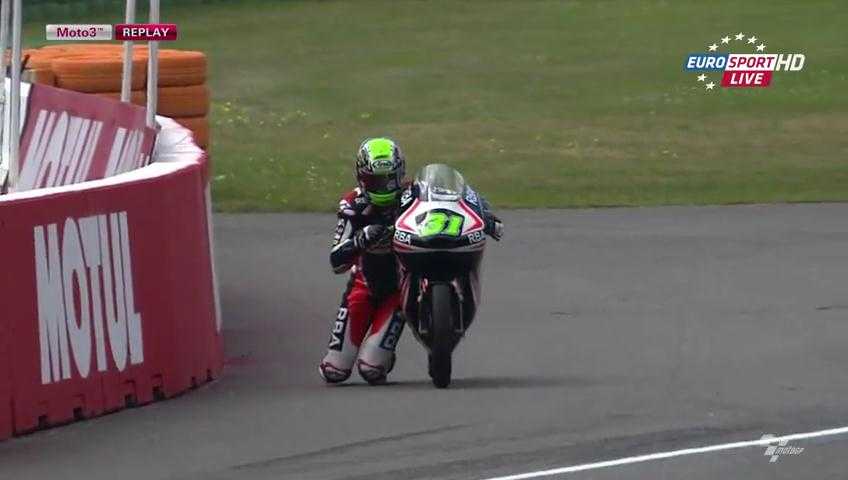 Tại giải đua Grand Prix ở Hà Lan, tay đua trẻ Niklas Ajo thuộc đội KTM đã mất kiểm soát ở khúc cua cuối khiến anh bị văng ra ngoài.