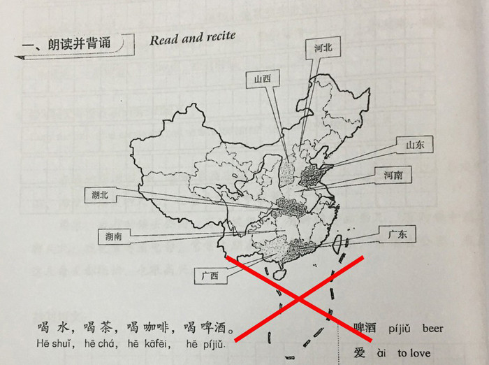 Hình bản đồ Trung Quốc có "đường lưỡi bò" trong trang 36 của giáo trình Elementary Reading and Writing Course (Đọc-Viết) (bên trái) và hình "đường lưỡi bò" rất nhỏ tại trang 32 của giáo trình Elementary Listening Course (Nghe) (bên phải). (Ảnh: Anh Thư)