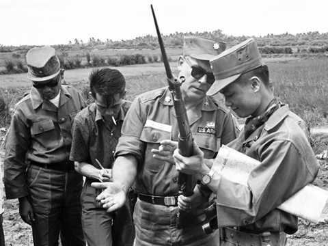 | Phạm Xuân Ẩn (thứ hai từ trái) đang tác nghiệp dưới vỏ bọc là một phóng viên - Ảnh: Tư liệu |