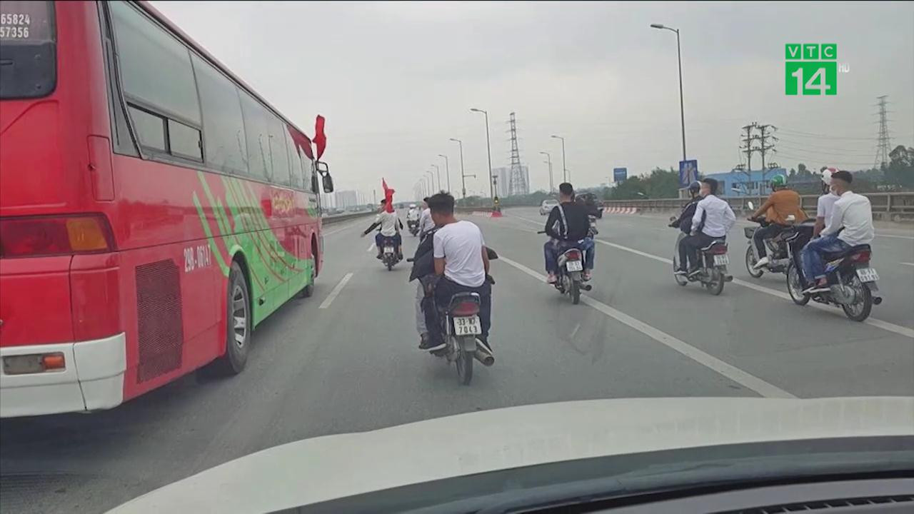 Hàng chục thanh niên liều lĩnh điều chạy xe máy vào đường trên cao dành riêng cho ô tô, thậm chí cố tình chạy trước đầu xe chở tân binh để tiễn bạn nhập ngũ.