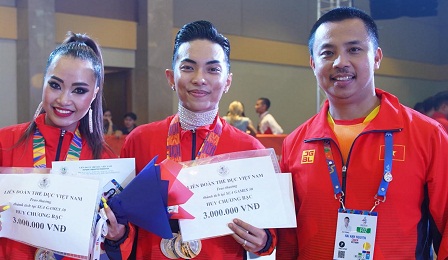 Chí Anh thay mặt Liên đoàn Thể dục Việt Nam trao "thưởng nóng" cho Phan Hiển và bạn nhảy.