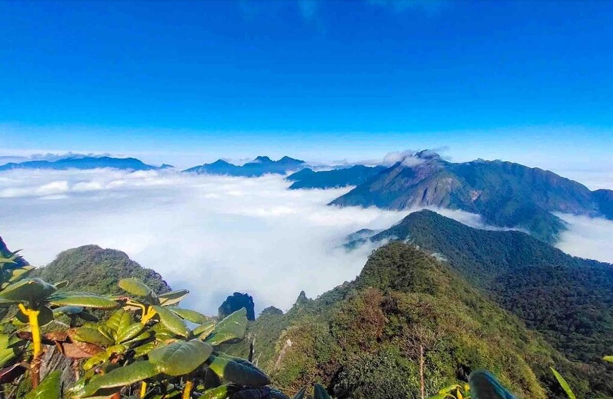 Phần thưởng dành cho những ai kiên trì chính là khung cảnh tuyệt đẹp, với mây trắng bồng bềnh ôm trọn lấy những dãy núi xung quanh.