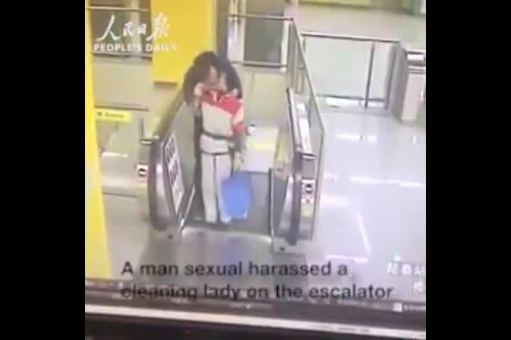 Vụ việc xảy ra vào ngày 15/2 tại một ga tàu ở thành phố Tô Châu, tỉnh Giang Tô, Trung Quốc. Trong đoạn clip do camera giám sát ghi lại, gã đàn ông đứng trên cùng một thang cuốn với nữ lao công.