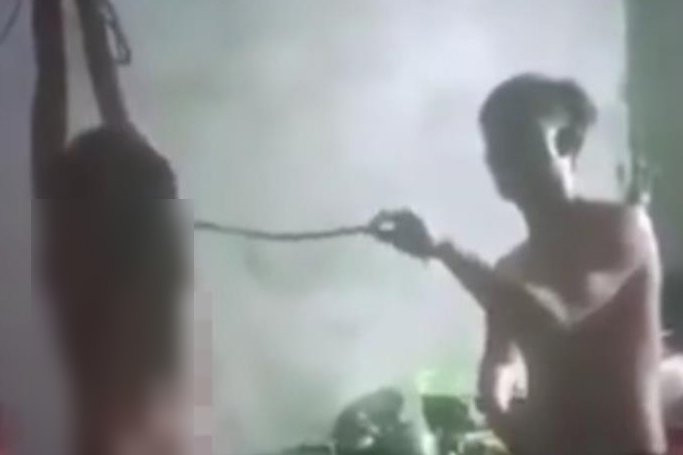 Hình ảnh bé gái bị trói tay, treo lên trần nhà. (Ảnh cắt từ clip).