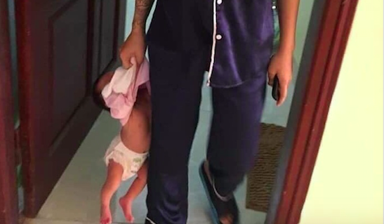 Hình ảnh người phụ nữ túm áo, xách em nhỏ trên tay.