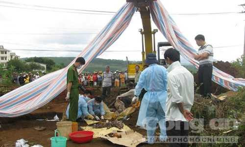 | Cơ quan giám định pháp y Lâm Đồng thực hiện nhiệm vụ khai quật tử thi hết sức khẩn trương, cẩn thận. Hơn 3 năm, xác của 2 nạn nhân chỉ còn lại phần xương cốt. |