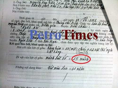 Trong biên bản bàn giao, đã ghi rõ phần "di vật của liệt sỹ" (tức là các vật đi kèm chứ không phải hài cốt): 13 mảnh bát vỡ. Vậy là ngay từ đầu, đoàn quy tập đã xác định đây là mảnh bát vỡ chứ không phải hài cốt. Vậy mà về sau, có cơ quan chức năng lại mang mảnh sành này ra kiểm định và tuyên bố là... mảnh sành. Rõ ràng, đã là mảnh sành thì kiểm định 1000 lần cũng là mảnh sành mà thôi.