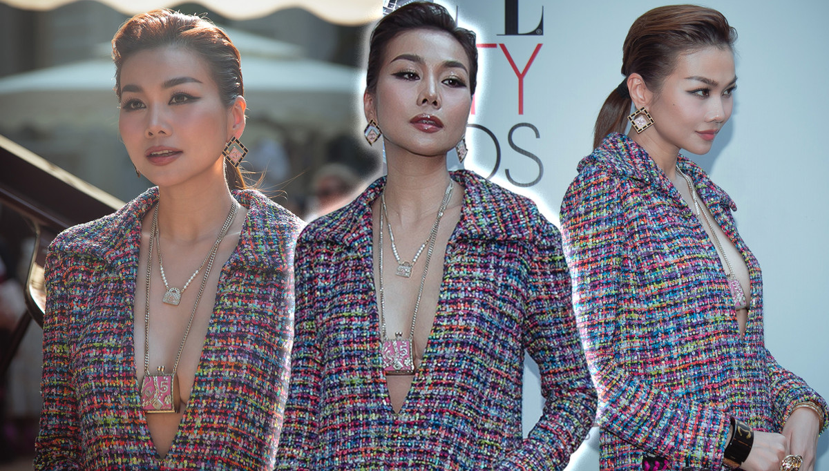 Vừa trở về từ chuyến đi Thái Lan, người đẹp xuất hiện đầy năng lượng. Cô diện set đồ hàng hiệu bằng vải tweet với xẻ ngực sâu. Là người có kinh nghiệm, Thanh Hằng không gặp sự cố gì với bộ cánh gợi cảm này.