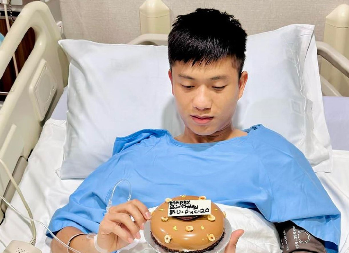 Trên trang cá nhân, tiền vệ Phan Văn Đức đăng tải tấm hình kỷ niệm ngày sinh nhật trên giường bệnh. Cầu thủ gốc Nghệ An mới trải qua ca phẫu thuật dây chằng gối.