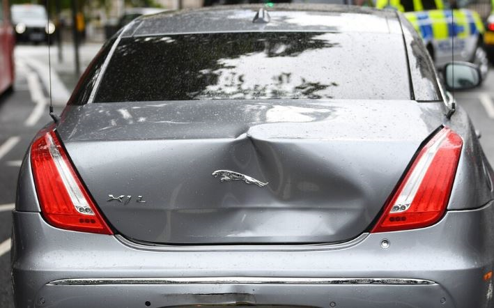 Xe Jaguar của Thủ tướng Anh hiện rõ vết va chạm phía sau.