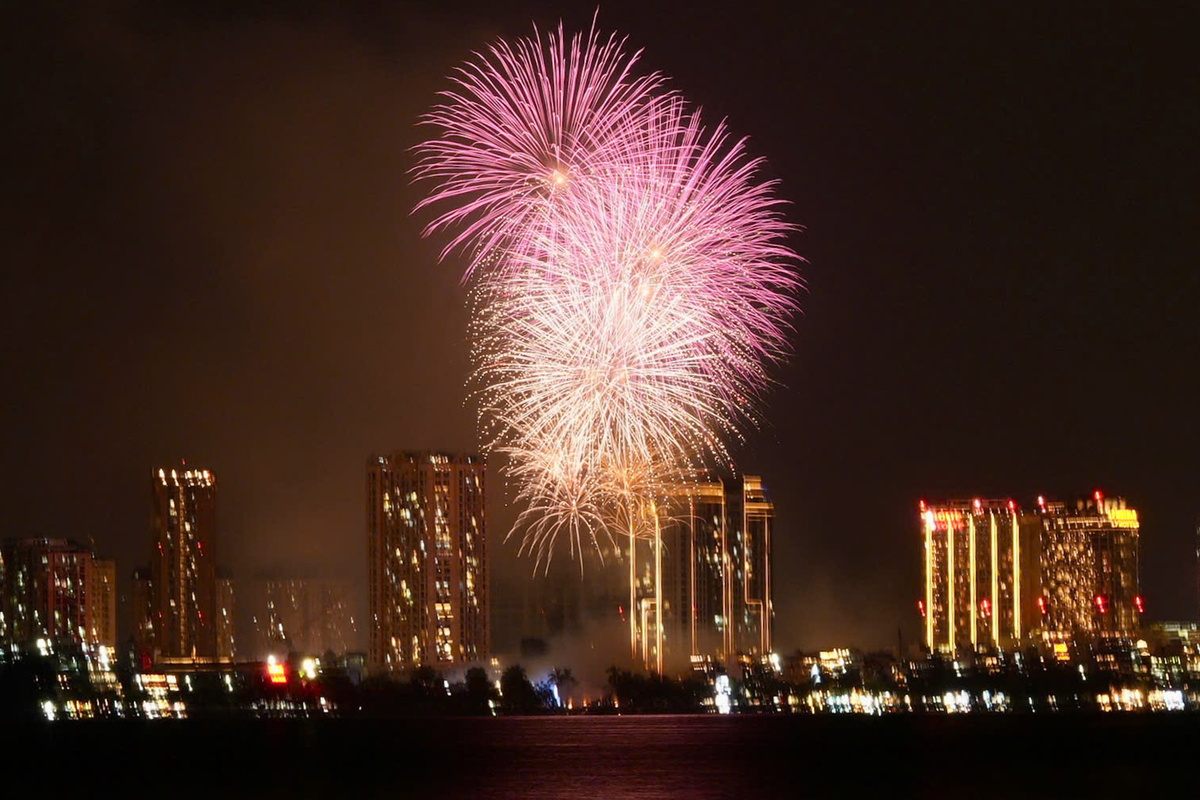 Pháo hoa bừng sáng bầu trời, tạo nên khung cảnh lung linh, đẹp mắt bên bờ biển TP.HCM.