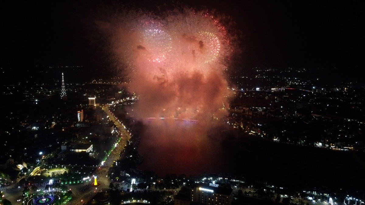 Tối 28/9, pháo hoa bắt đầu nổ vang, sáng rực bầu trời thành phố Việt Trì, Phú Thọ, thu hút hàng chục nghìn người theo dõi.