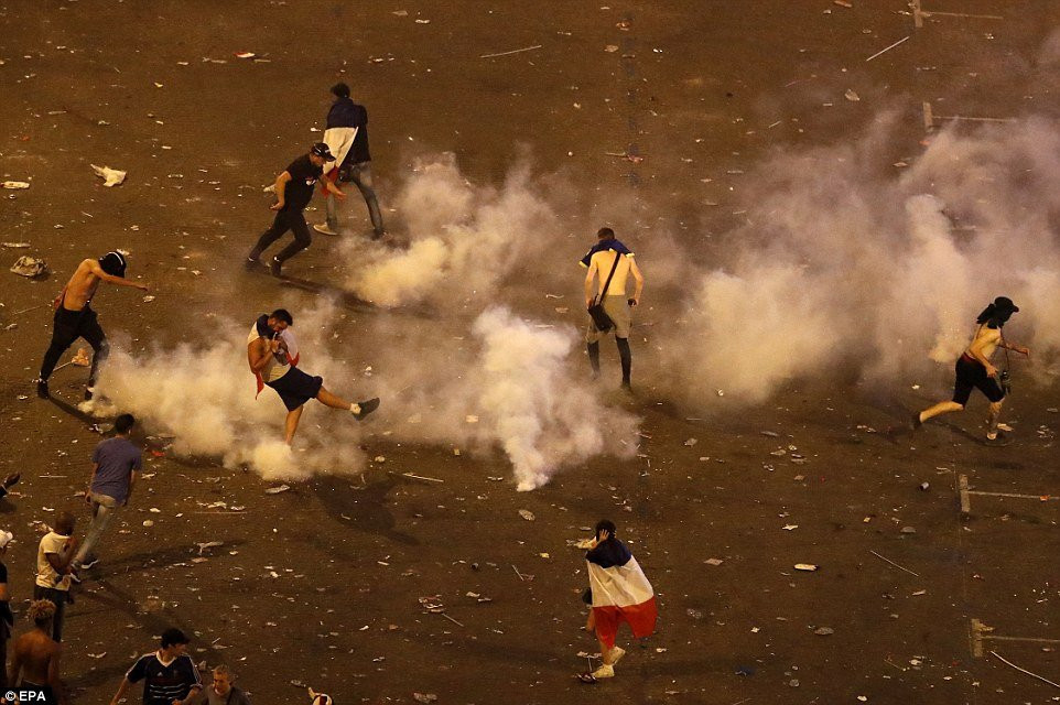Theo Daily Mail, cảnh sát Pháp phải giải quyết khá nhiều vụ bạo loạn trong đêm qua, không chỉ ở Paris. Ở một số địa điểm, các cổ động viên thay vì ăn mừng cùng nhau lại xảy ra ẩu đả, có người còn ném pháo sáng vào lực lượng an ninh. Nhiều xe cộ, công trình công cộng và hàng quán cũng bị phá hoại bởi những kẻ quá khích.