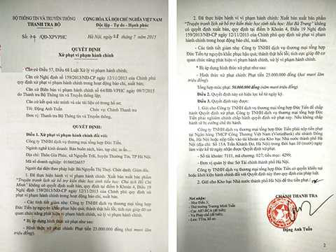| Quyết định xử phạt hành chính Công ty TNHH Đức Tiến của Bộ Thông Tin và Truyền Thông |