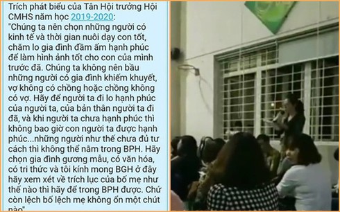 Hãy chọn gia đình gương mẫu, có văn hóa, có tri thức và tôi kính mong Ban giám hiệu ở đây xem xét về trích lục của bố mẹ, gia đình như thế nào thì hãy để trong Ban phụ huynh được. Chứ còn lệch bố lệch mẹ thì không ổn một chút nào".
