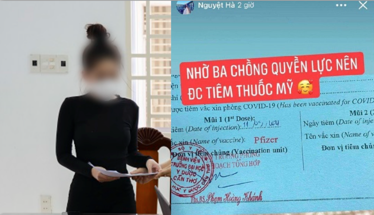 Trước đó, ngày 12/9, H. đăng lên Facebook cá nhân hình chụp giấy chứng nhận đã được tiêm vaccine ngừa COVID-19 (đã che thông tin cá nhân người được tiêm) kèm dòng trạng thái: “Nhờ ba chồng gửi vô k á. Nên được tiêm thuốc Mỹ...". Sau đó, H. xóa và đăng lại lần 2 với nội dung: "Nhờ ba chồng quyền lực nên được tiêm thuốc Mỹ...".