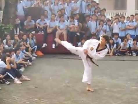 Đoạn clip dài 1 phút 37 giây, được thành viên Angelbobble10 đưa lên mạng Youtube hôm 11/1 vừa rồi. Nhân vật chính được chủ nhân clip giới thiệu là thầy T., trong bộ võ phục màu trắng, đai đen đẳng cấp, đang đi một bài quyền Taekwondo uyển chuyển trên sân trường.
