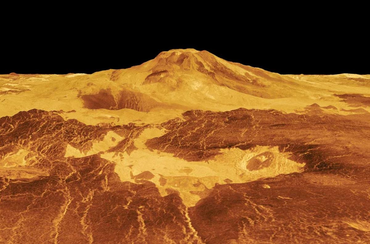 Maat Mons, cao 9km, là ngọn núi cao nhất sao Kim. Một cấu trúc sụp xuống tạo thành hõm chảo cho thấy dấu hiệu của một vụ phun trào núi lửa. (Ảnh: NASA)
