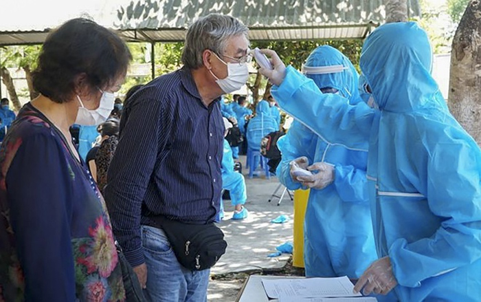 Nhân viên y tế đo thân nhiệt cho công dân Việt Nam từ vùng có dịch COVID-19 từ nước ngoài trở về Quảng Ngãi. (Ảnh: H.P)