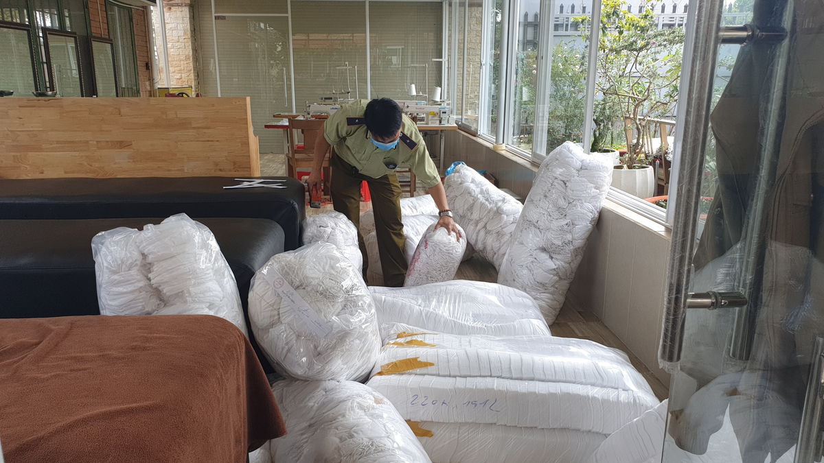 Thời điểm kiểm tra, bà N. chỉ xuất trình được giấy chứng nhận đăng ký kinh doanh “Gia công hàng lưỡi câu”, không có giấy chứng nhận đăng ký kinh doanh mặt hàng khẩu trang. Bà cũng không có hóa đơn, chứng từ chứng minh nguồn gốc nguyên liệu đầu vào. Số khẩu trang thành phẩm tại đây không có nhãn mác.