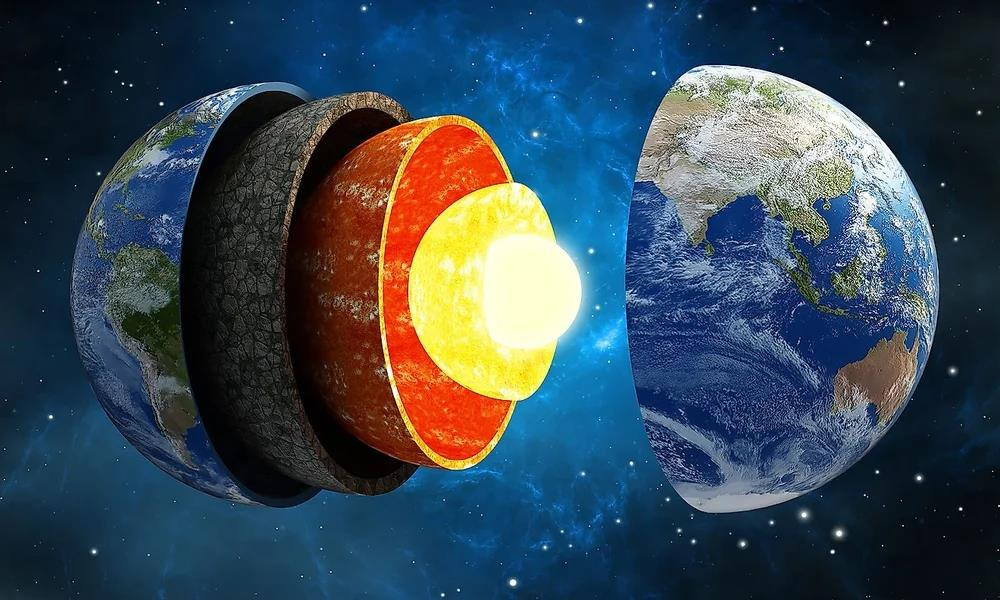 Vùng chuyển tiếp giữa lớp phủ trên (nâu) và dưới (cam) của Trái Đất được cho là chứa một lượng nước đáng kể, liên kết trong đá. (Ảnh: Worldatlas)