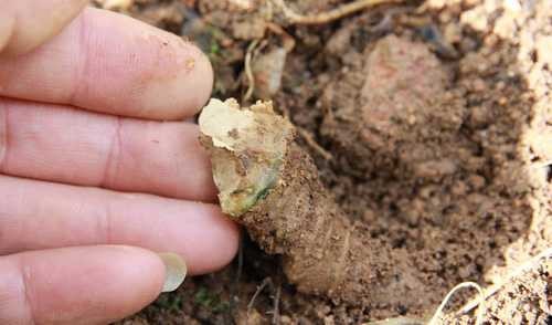Gạt lớp đất mỏng lộ ra củ sâm lớn