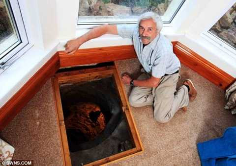 | Vợ chồng ông Colin bên chiếc hố sâu ở phòng khách được cho là giếng cổ được đào từ thế kỷ 16 |