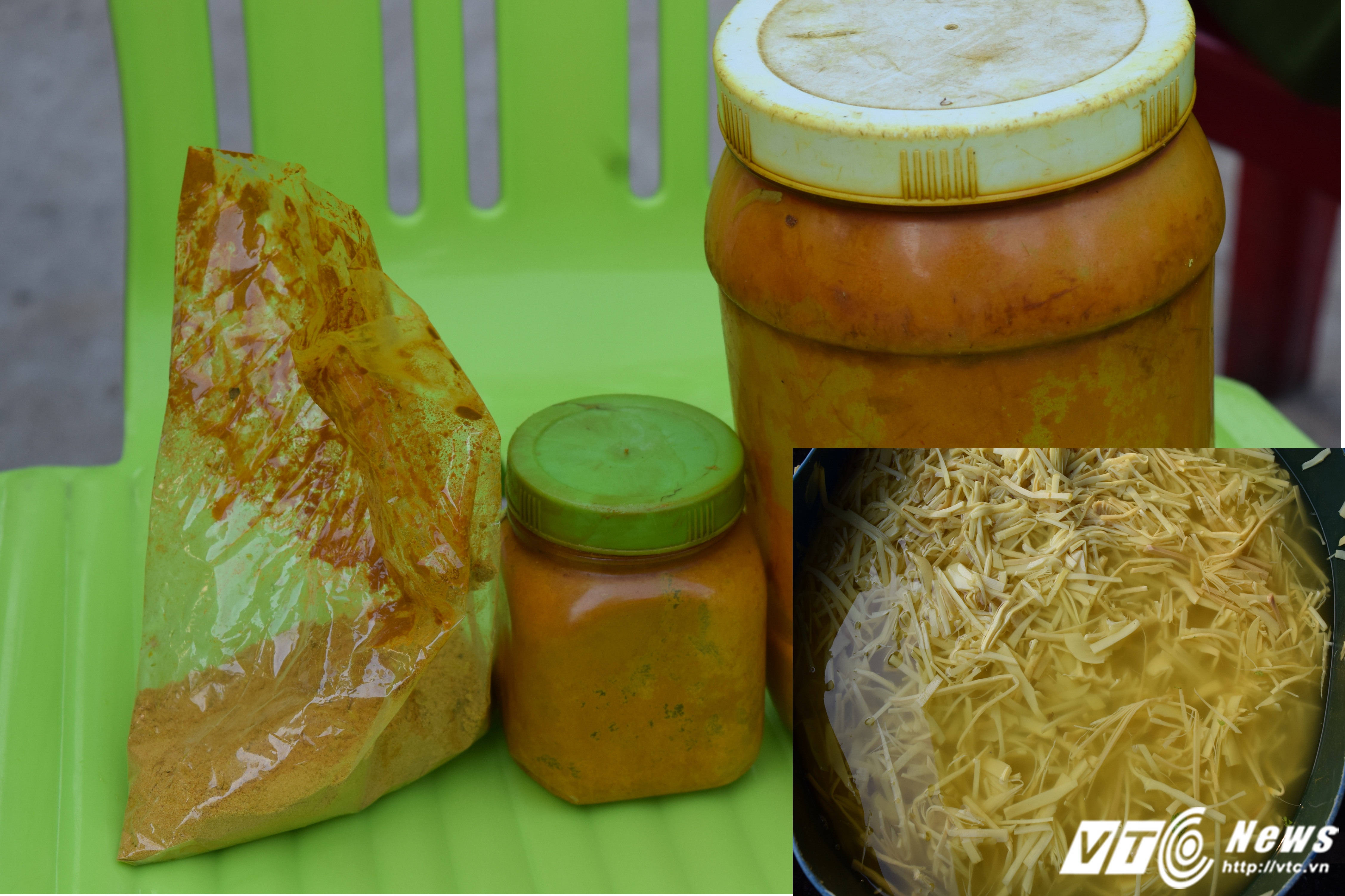 | Chất vàng ô (Auramine) - một chất cực độc được hai cơ sở bỏ vào ngâm cùng măng tươi khoảng 5 - 10 phút rồi mang bán cho khách hàng. |