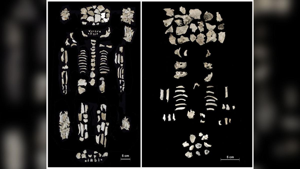 Hài cốt của người phụ nữ (trái) và cặp song thai (phải). (Ảnh: PLOS One)